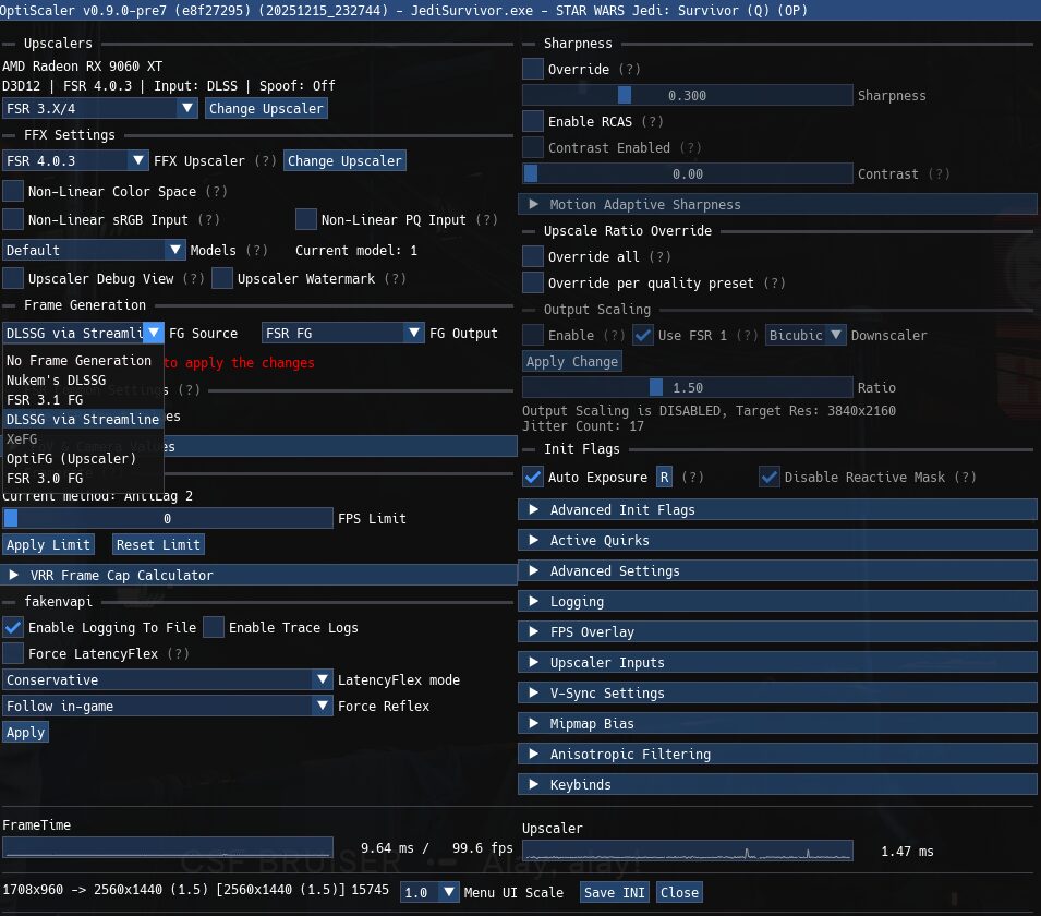 Em títulos que usam versões iniciais do Streamline, o Optiscaler recorre ao chamado OptiFG, um método que utiliza os mesmos dados do upscaler ativo para gerar quadros adicionais. Nesse caso, o usuário seleciona o FSR como upscaler e define o FSR Frame Generation como saída.