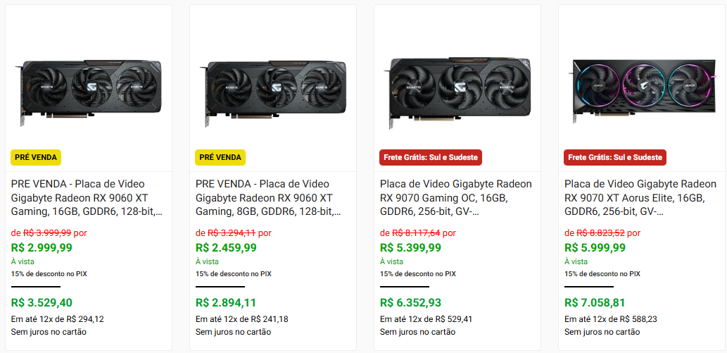 E o modelo Radeon RX 9700 XT, o topo de linha da geração 9000, tem preços um pouco acima na casa de R$4.700.