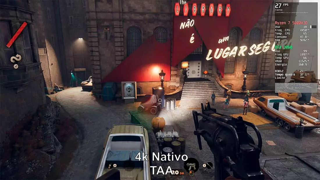 Hora de ver a evolução versus o FSR 1.0, e como fica a disputa com o DLSS em termos gráficos. Fizemos comparativos com as resoluções 4K e também o Full HD, com placas de entrada e intermediárias tanto de Nvidia quanto AMD. Para o primeiro teste, vamos ver o desempenho em uma cena 4K:
