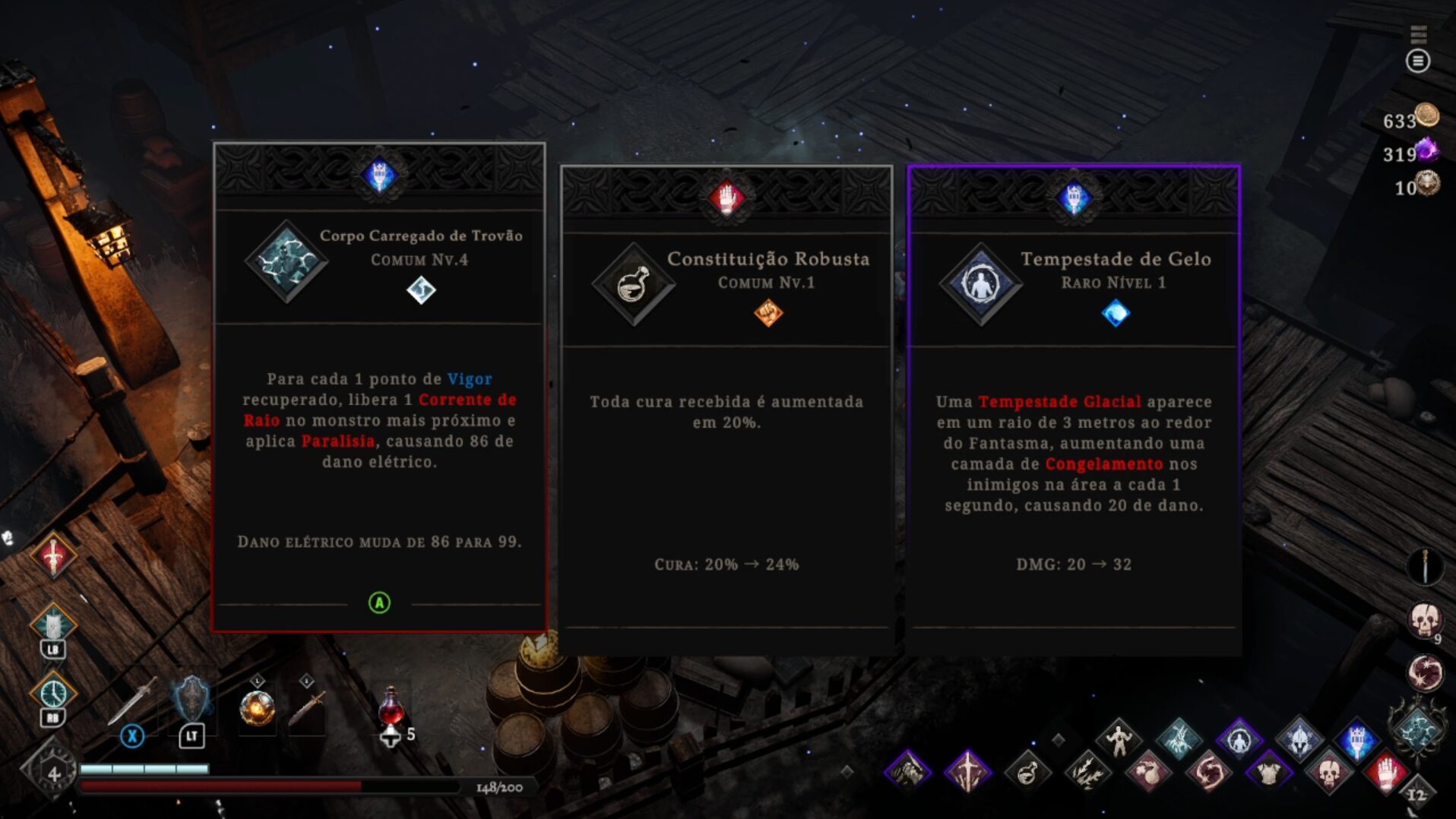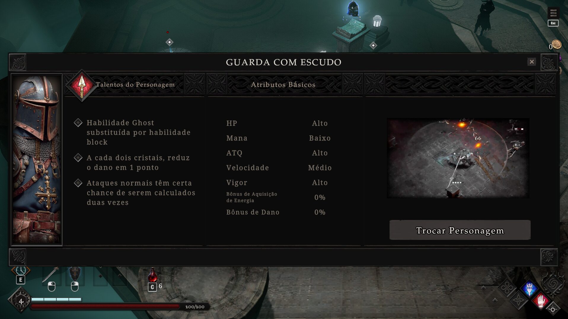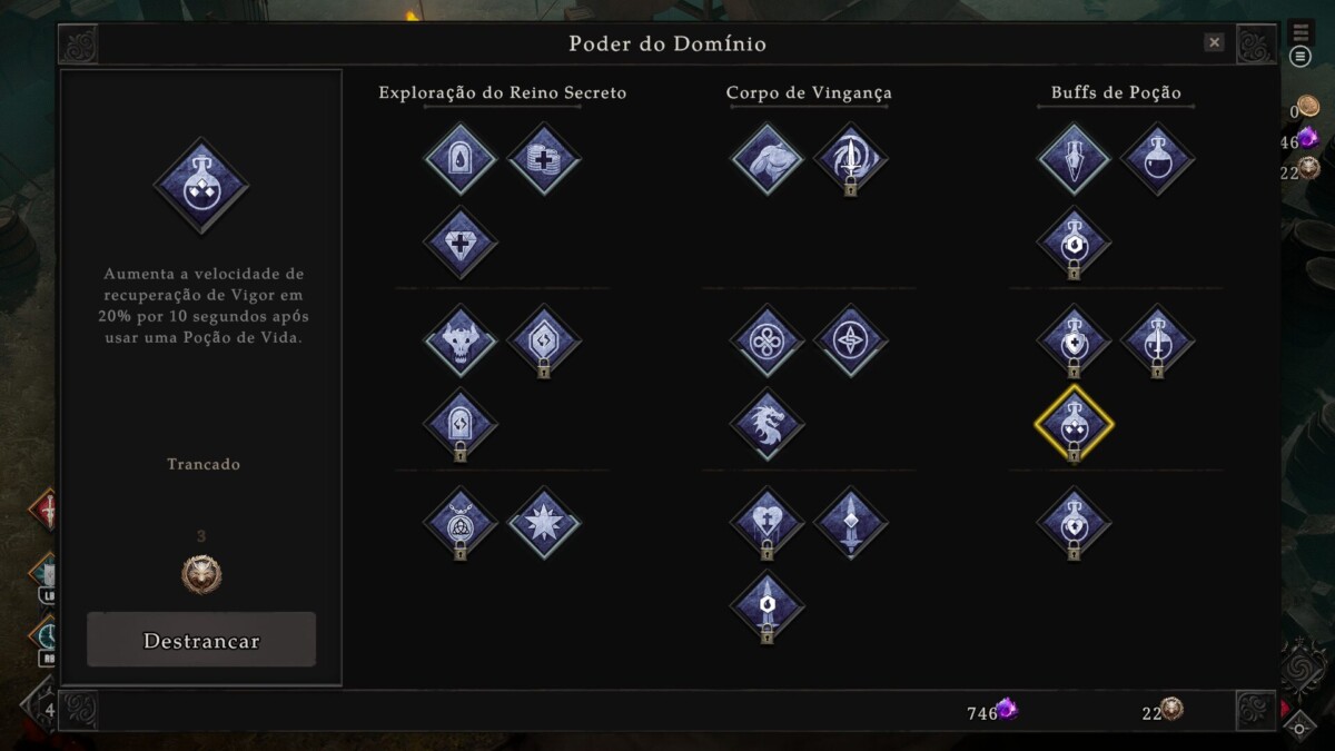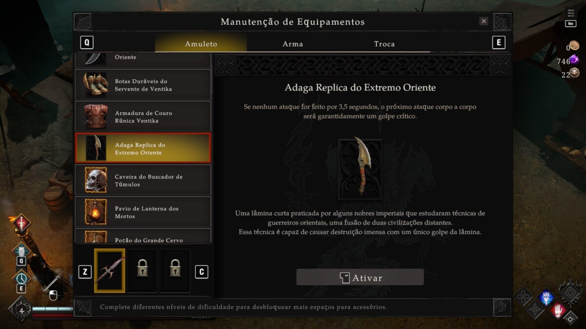 Por fim, existem as relíquias, que o jogador pode equipar até duas e, cada uma, concede dois bônus. Um bônus passivo e outro vinculado a alguma outra mecânica ou habilidade. Como há um limite, ao obter novas, o jogador pode optar por melhorar uma das que já possui.