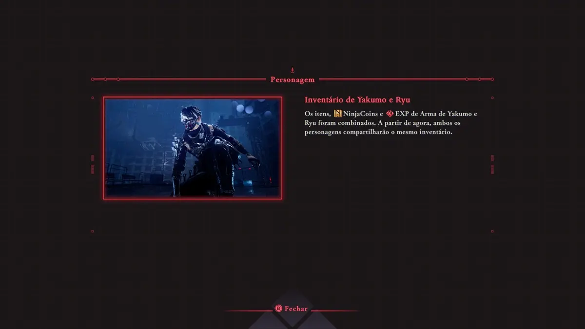 O caso de Yakumo é um pouco mais interessante, pois temos um menu mais tecnológico, com opções de conversas com sua aliada ninja, Umi, que traz alguns diálogos importantes — e também temos a possibilidade de comprar, com as moedas do jogo, novas habilidades com um mestre do clã Corvo.