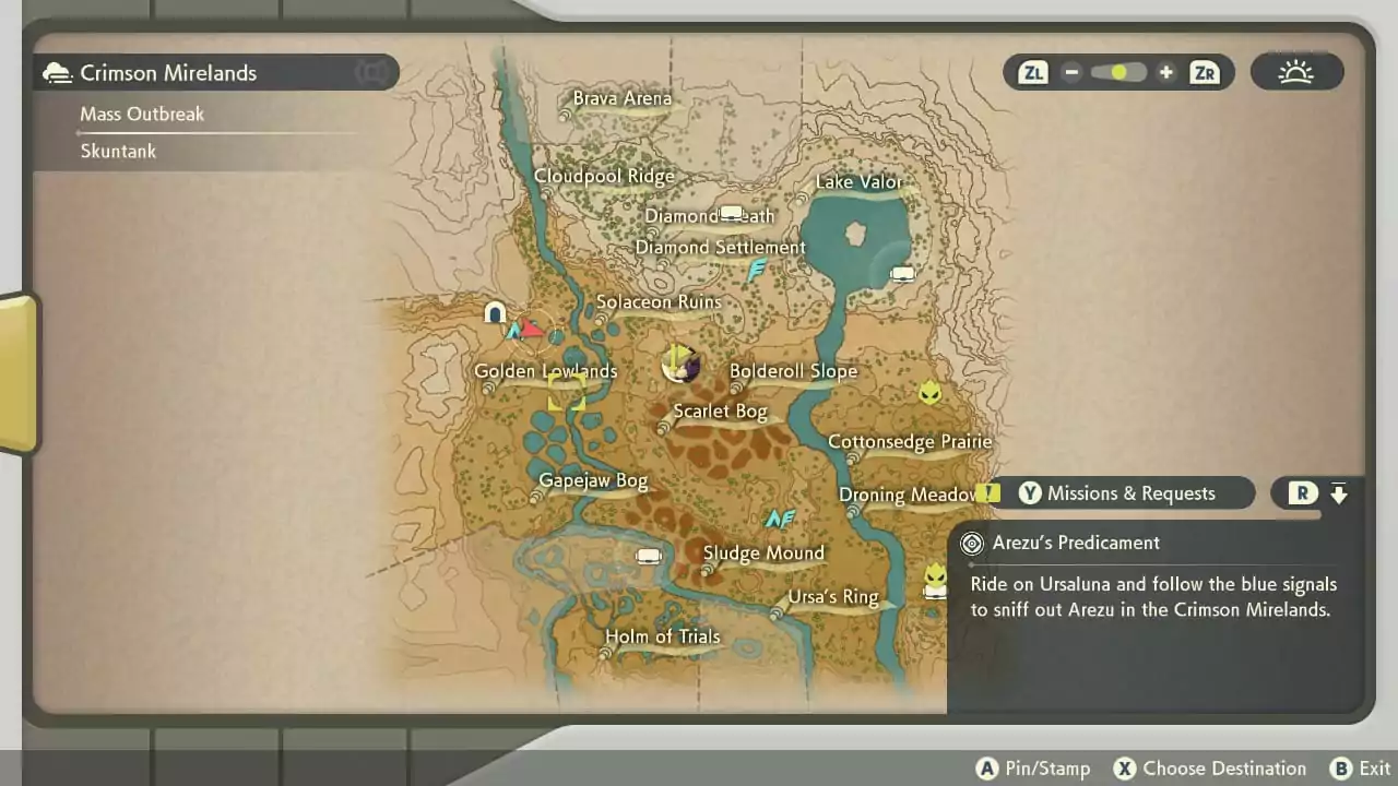 O jogo não é exatamente um mundo aberto, mas vários mapas segmentados – mais parecido com um Monster Hunter do que com um Zelda Breath of the Wild. O resultado é bom, já que, apesar de não entregar a continuidade de um mapa amplo e único, cada lugar é bastante grande e dá pra ficar um bom tempo buscando itens, Pokémon ou novas localidades. Pokémon Legends: Arceus também faz um bom trabalho em liberar progressivamente novas criaturas para o jogador alcançar novas áreas, seja se movendo mais rápido, nadando, escalando ou até voando.