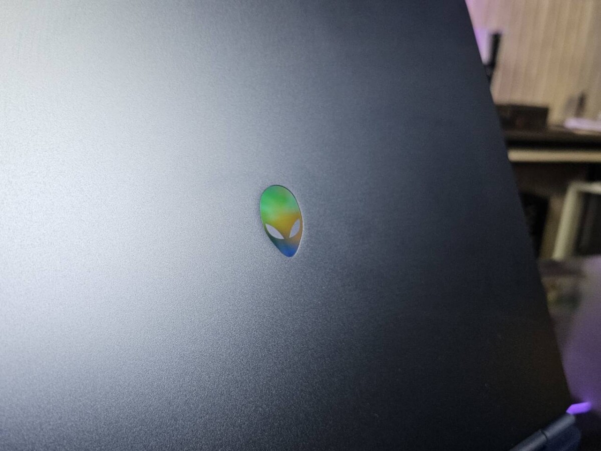 O material tem uma cor azulada com um leve brilho, com o estiloso nome de Shadowy Indigo, e a logo da Alienware, que apesar de não ser retroiluminada, tem um efeito de brilho para destacar o icônico mascote da marca.