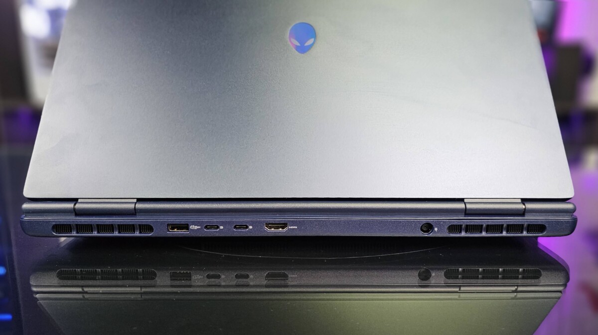 O restante, com mais duas portas no formato USB-C geração 3.2 (10Gbps) com suporte a DisplayPort 1.4a (ligadas a iGPU), uma porta USB 3.2 (5Gbps) do mais tradicional Tipo-A, e por fim uma HDMI 2.1 (ligada a dGPU) ficam na parte traseira, fechando um bom conjunto de conexões disponíveis.