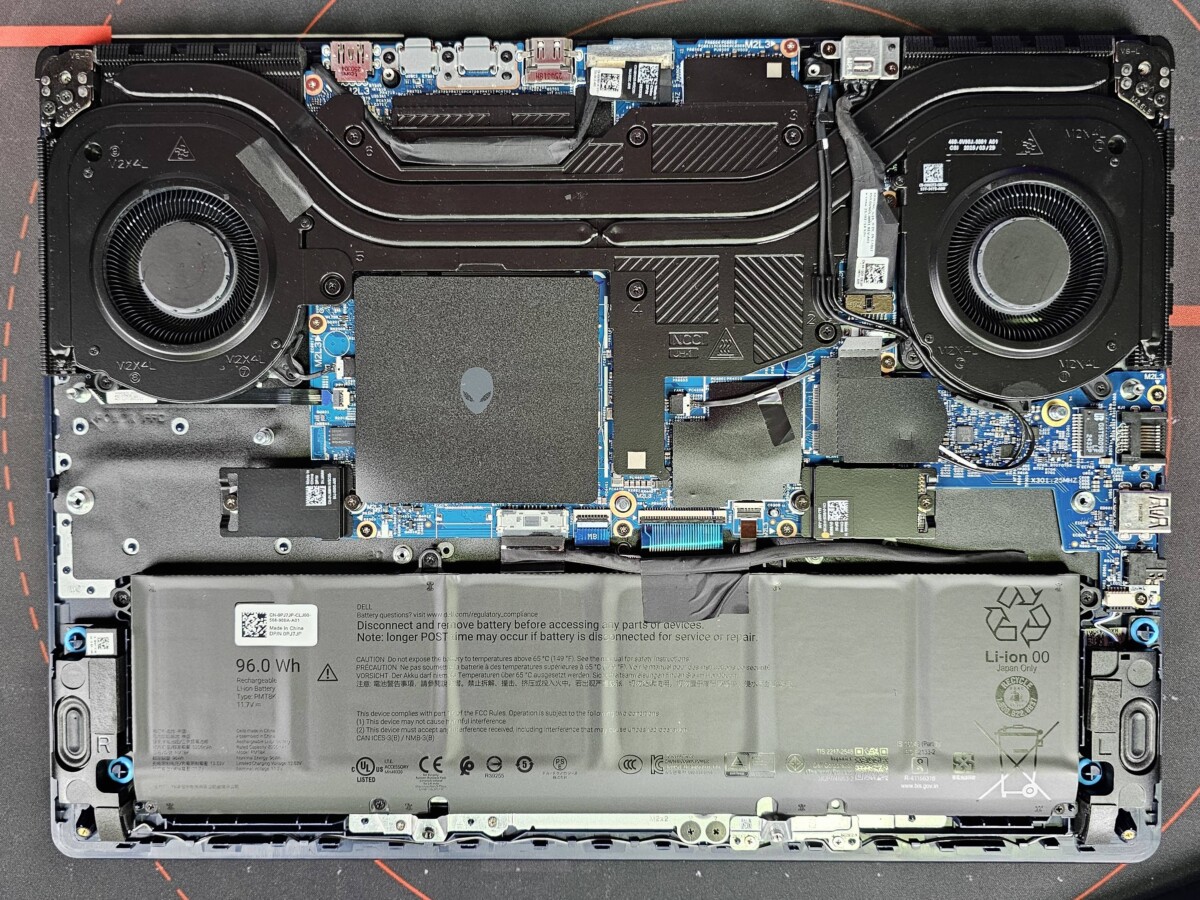 Temos o conjunto tradicional de upgrades possíveis, com dois slots de memória DDR5-5600 (ou 5200, no caso dos modelos com Core 5), expansíveis a até 32GB e mais dois slots para SSD (sendo que um livre para upgrade). Também dá para trocar a placa wireless, porém por vir com um modelo WiFi 7, já bem atualizada, acho pouco provável que você vá querer mexer nisso.
