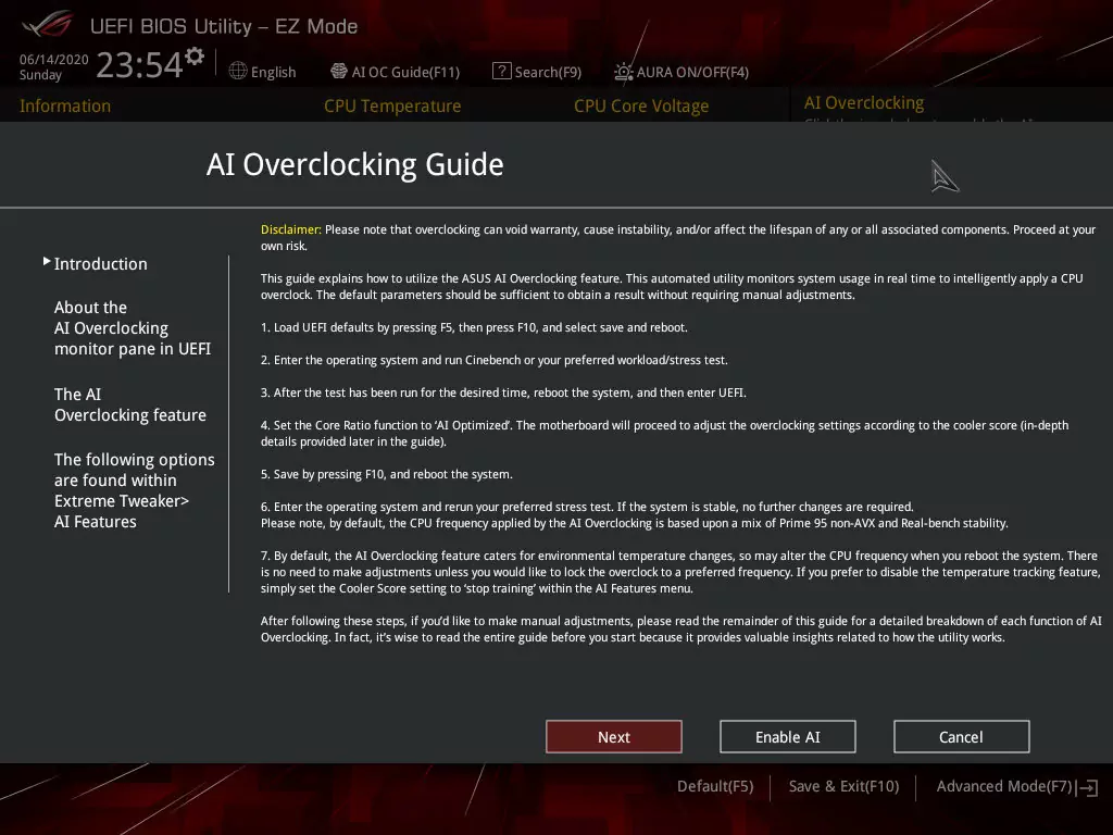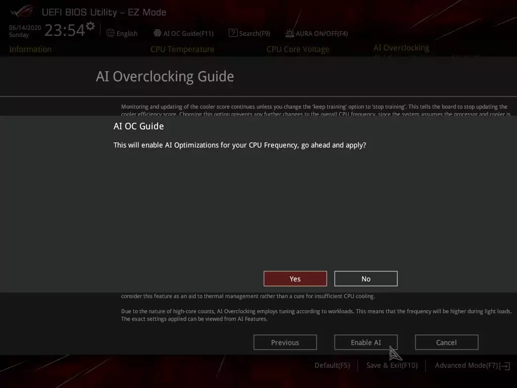 Como um dos atrativos dessa geração, o sistema IA foi aprimorado, ele analisa o hardware instalado e busca o melhor cenário de configuração, desde setar o XMP máximo das memórias, até realizando o overclock, levando em consideração o cooler instalado, tudo sem que o usuário entenda bulhufas de configuração, muito legal já que grande parte dos usuários sequer seta o perfil XMP máximo de suas memórias, e acaba perdendo um ganho desempenho considerável dependendo o hardware que possui.
