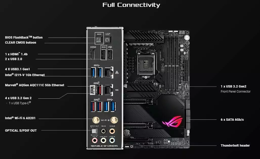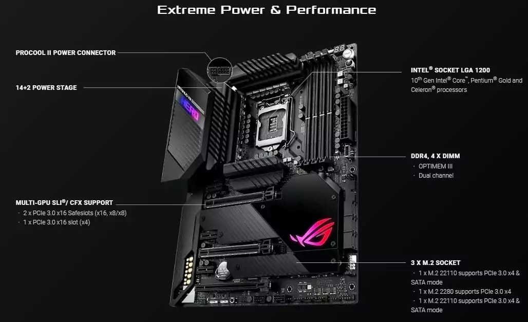 Como grandes destaques da HERO temos o suporte a memórias de até 4800MHz, 3x slots M.2 PCIe 3.0, 2x conexões de LAN sedo uma de 5Gb, Wi-Fi 6 e Bluetooth 5.1, sistema de áudio SupremeFX de 7.1 canais e várias conexões USB, incluindo 3.2 Gen2.