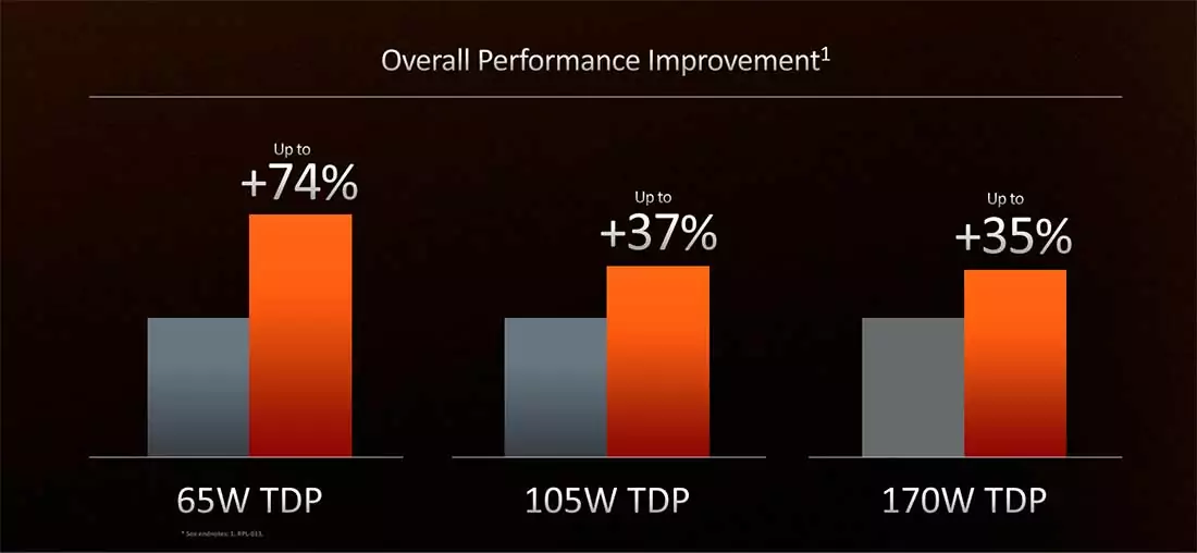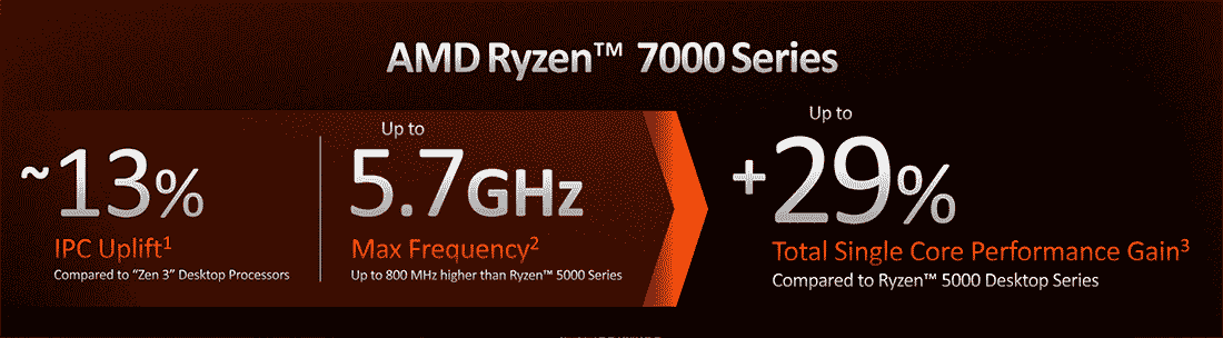 Como o Ryzen 7000 tem um aumento de IPC de 14% comparado a um Ryzen 5000, mas também opera em mais ciclos de processamento por segundo, o resultado é um incremento de performance de 39% consumindo a mesma quantidade de energia que seu antecessor, e um ganho de 20% em games, segundo estimativas da AMD.
