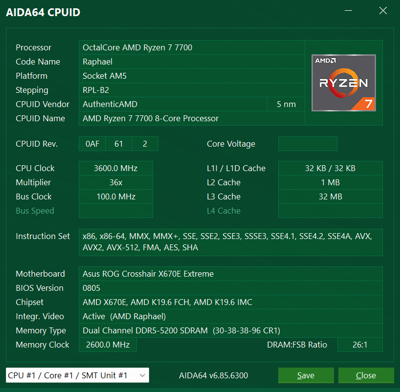 Através do aplicativo AIDA64, vemos algumas informações técnicas do processador, como modelo, clocks, número de núcleos e threads, etc. A frequência das memórias é definida pela recomendação do processador testado, no caso, 5200MHz.