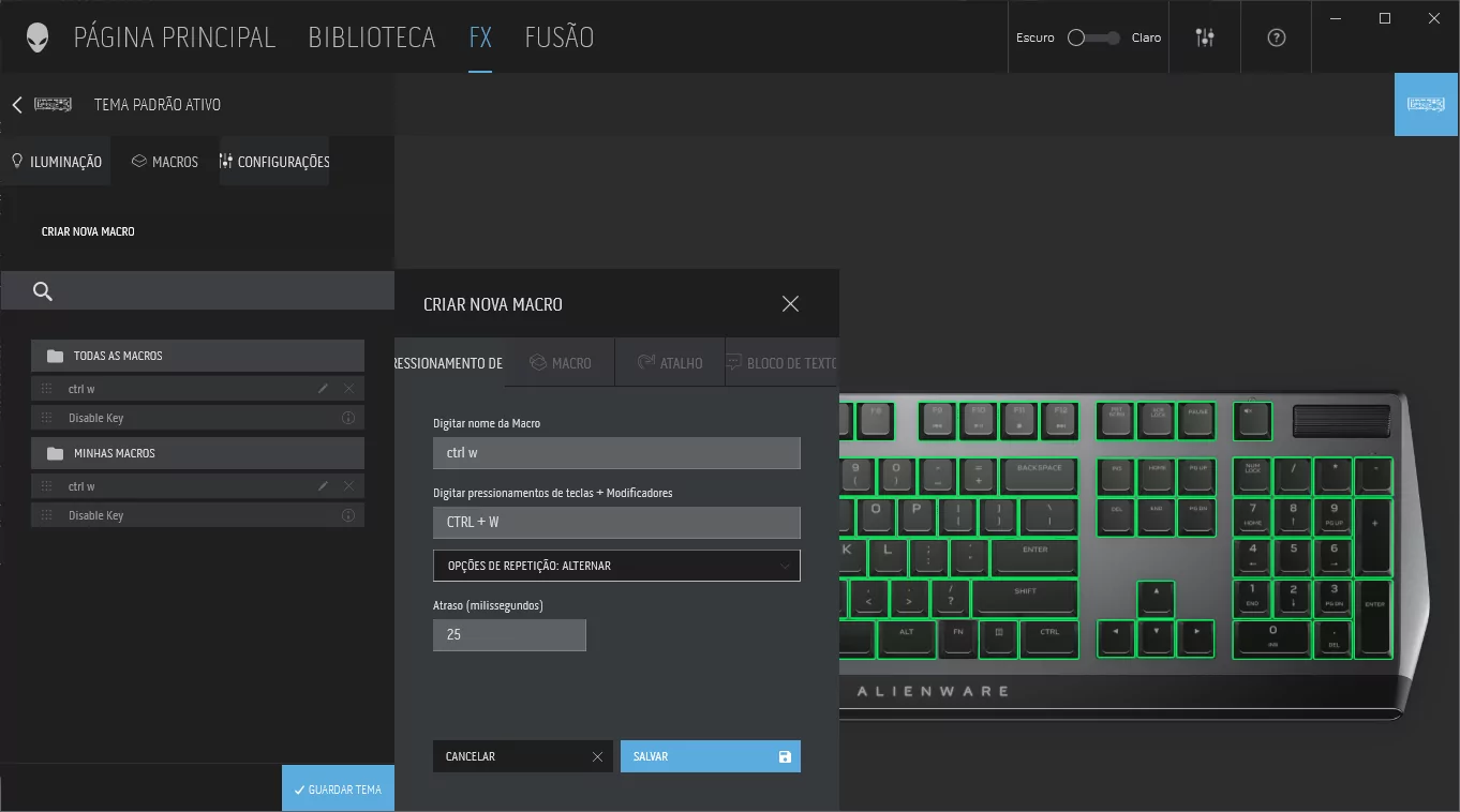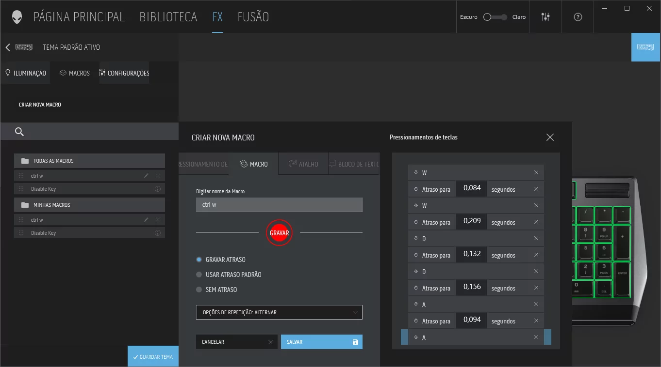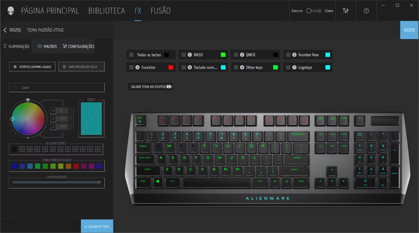 Na primeira aba temos o controle de iluminação, onde podemos definir múltiplos efeitos para o AW510K, assim como também definir efeitos para as camadas pré-definidas (WASD, Numérico, Logo…). É também possível definir um “efeito após pressionar a tecla”.