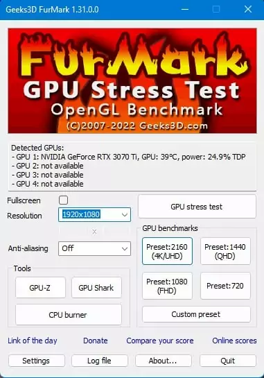 Outro velho conhecido, atuando desde 2007 no segmento de testes de placa de vídeo. Muito útil para saber se o sistema de refrigeração está funcionando adequadamente, porque o objetivo deste software é justamente este: checar os limites de temperatura e a estabilidade alcançada. Continua recebendo suporte, e prossegue sendo muito relevante para o seu uso. É simples, objetivo e gratuito.