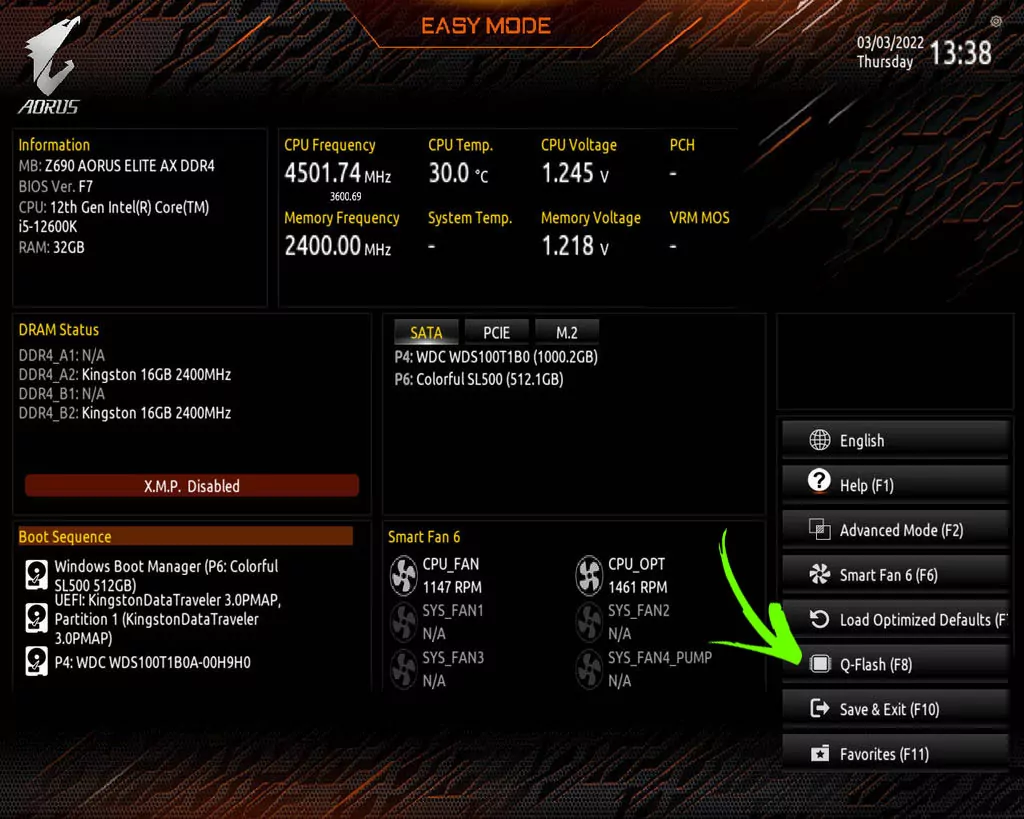 Q-Flash é a versão da Gigabyte da ferramenta de atualização. Ela está disponível tanto no EASY MODE por meio do F8 do teclado, quanto no modo avançado.