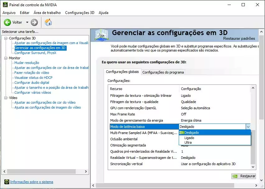 Um centésimo de segundo pode não parecer muito, mas toda redução na latência é bem-vinda e, principalmente, essa redução é obtida sem fazer upgrade no sistema, só uma configuração de software. Para ativá-la, basta acessar o Painel de Controle da Nvidia, e clicar em “Gerenciar as configurações em 3D” e alternar o “Modo de latência baixa”.