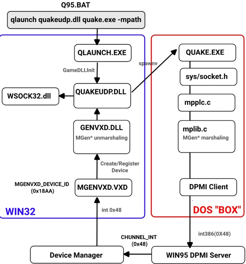 E, mais importante, fornecia o dispositivo virtual genvxd.dll, capaz de traduzir chamadas de rede estilo BSD sockets (usadas pelo Quake) para o Winsock 95.