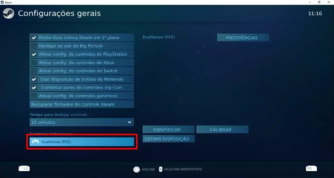 Clicando no controle conectado, você pode mudar o nome do controle e outras configurações da luz do controle como cor, brilho e saturação em Preferências. Você pode calibrar os principais sensores do controle em Calibrar ou até mapear os botões de forma customizada em cada botão do DualSense.