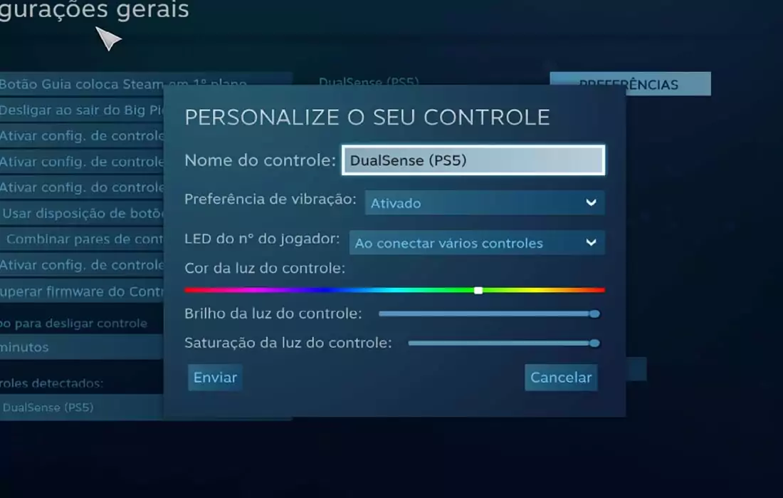 A partir de agora, ao conectar seu controle, a Steam vai reconhecê-lo automaticamente e aplicar a configuração padrão do DualSense, mas você pode customizar algumas coisas ainda na janela de configurações do controle.
