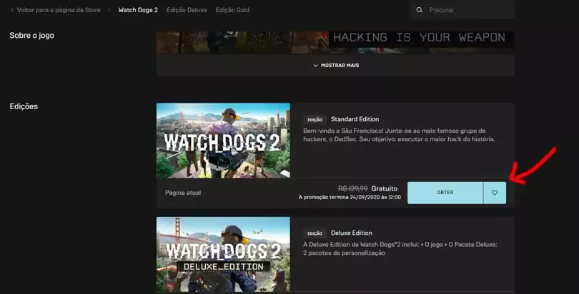Clique em “Ver Ofertas” e no botão “Obter”, na edição Standard de Watch Dogs 2.