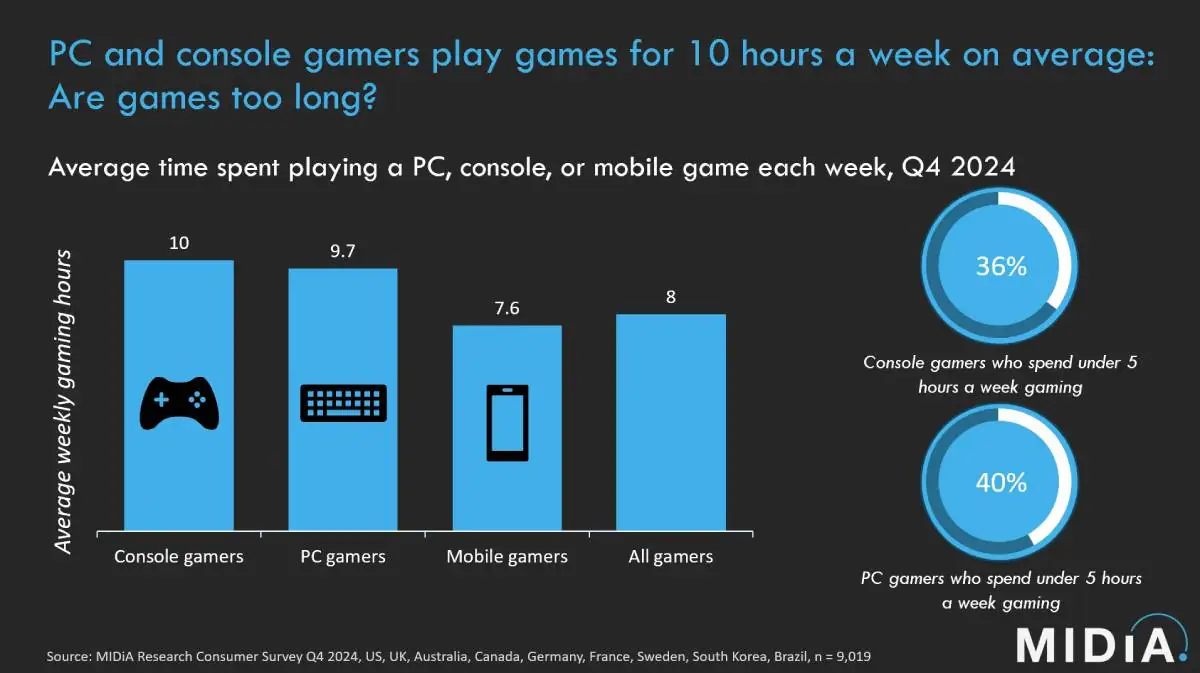 Uma pesquisa da Midia Research revelou que jogadores de PC e consoles passam, em média, 10 horas por semana jogando. O estudo, realizado no quarto trimestre de 2024, analisou hábitos de jogadores em diversos países, incluindo Brasil, Estados Unidos, Reino Unido e Coreia do Sul.