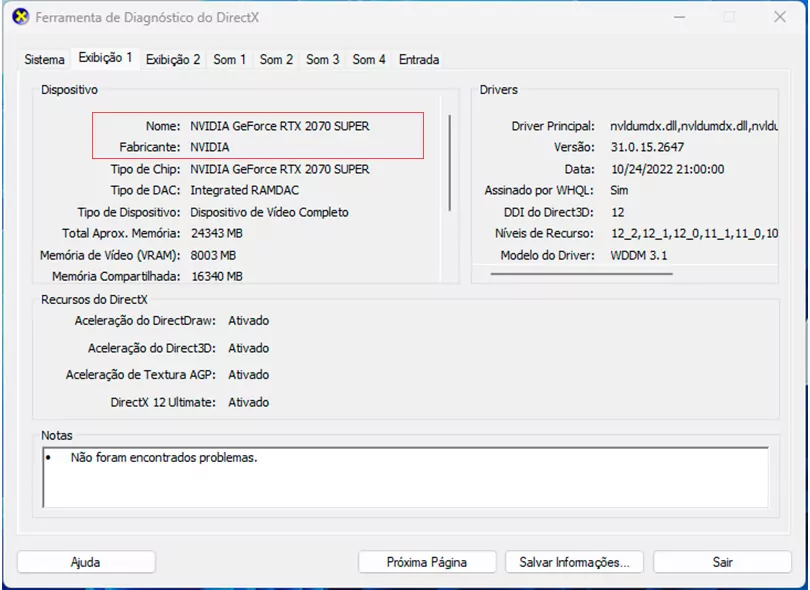 Há uma forma nativa do Windows. Basta ir até a barra de pesquisa do menu iniciar e digitar dxdiag e executar o arquivo disponível. Na parte de Sistema, será possível conferir qual é a fabricante e o modelo de placa-mãe presente em seu setup, além do processador utilizado. Já na seção Exibição 1 é onde está localizada a placa de vídeo do sistema.
