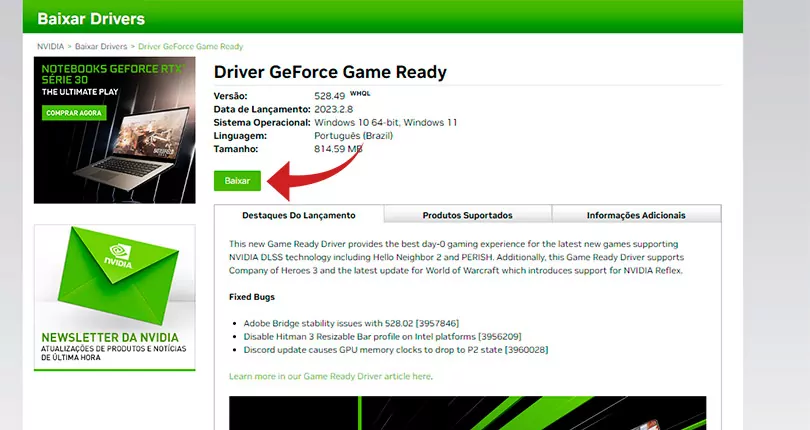 Para o caso de placas de vídeo NVIDIA, o caminho é procurar por “Drivers Oficiais NVIDIA” ou acessar este link. Na página indicada, será necessário descrever a placa gráfica presente no sistema, escolhendo o tipo de produto, série, família, sistema operacional, tipo de download e idioma. Na opção “Tipo de download“, é onde o usuário pode optar entre o Driver Game Ready (GDR), para drivers com foco em jogos, e Driver Studio (SD), para focos em aplicações profissionais em 3D.