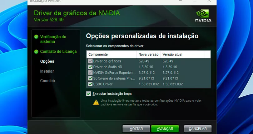 Nas opções de instalação, o usuário pode escolher entre uma instalação Expressa ou então Personalizada. A opção Personalizada permite executar uma instalação limpa que consiste, basicamente, num processo que apaga os dados de drivers anteriores e instalam a nova versão disponível. Isso, em tese, pode corrigir algum problema que drivers antigos estejam causando ao sistema. A instalação limpa também restaura as configurações NVIDIA para o padrão e remove os perfis criados.