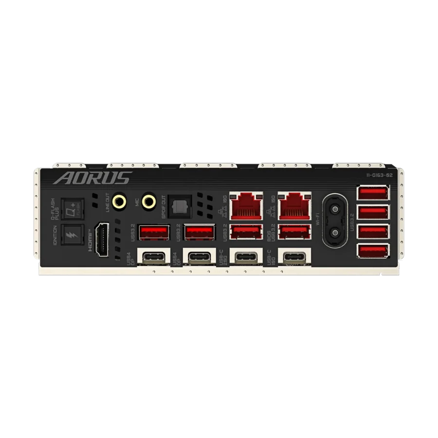 A conectividade inclui cinco slots M.2 com suporte a PCIe Gen5, um slot PCIe 5.0 x16 com blindagem metálica reforçada “UD Slot X”, duas portas LAN de 10 GbE, Wi-Fi 7 com antena RGB direcional e duas portas USB4 Type-C. Ela também vem com uma porta USB frontal de 65 W para carregamento rápido.