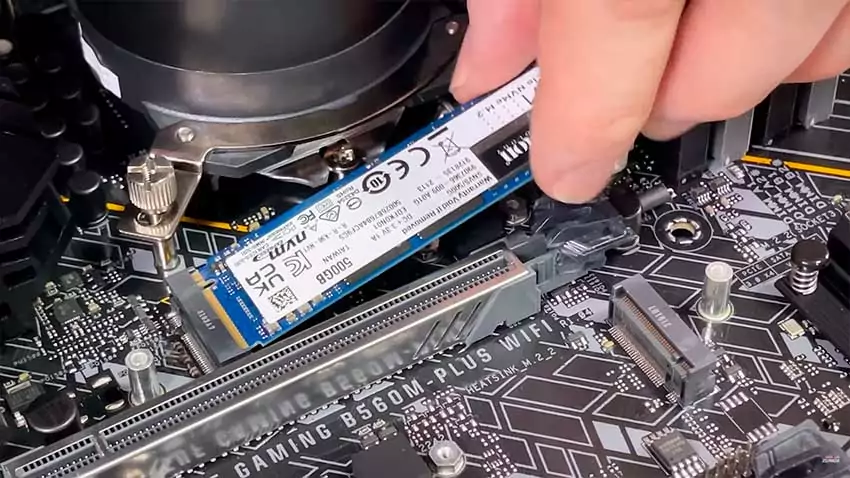 SSDs no formato M.2 são muito convenientes por serem compactos e não precisarem de cabos, mas é bom lembrar de ligá-los agora antes de por a mainboard pra dentro do gabinete. Em alguns casos, o slot para o SSD pode ficar obstruído por outros componentes como a placa de vídeo ou até mesmo ficar na parte de trás da sua placa-mãe. Algumas placas-mãe tem slot embaixo de estruturas de metal, e não é só para design: essas estruturas muitas vezes trazem thermal pads e podem ajudar na dissipação de calor desse componente, então faça uso disso!