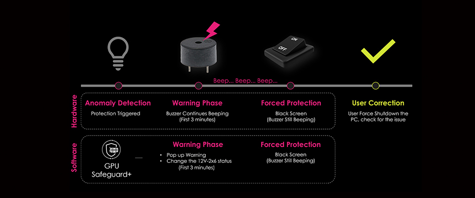 Quando a fonte de alimentação detecta uma anomalia, o sistema entra em uma fase de alerta. Um sinal sonoro é acionado e o MSI Center pode exibir um alerta pop-up com o status do conector. O usuário tem três minutos para reduzir a carga ou interromper a condição.