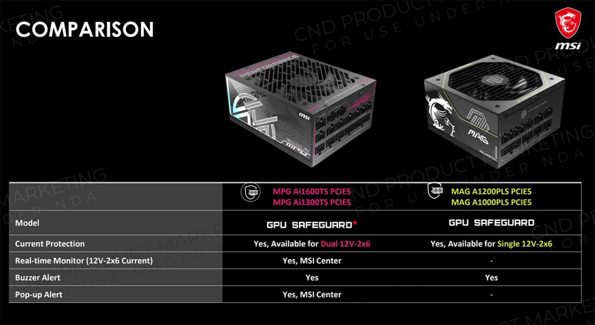 O GPU Safeguard+ está listado para a MPG Ai1600TS PCIE5 e a MPG Ai1300TS PCIE5. A MSI posiciona isso como uma proteção do lado da fonte de alimentação, em vez de monitoramento de energia do lado da GPU.