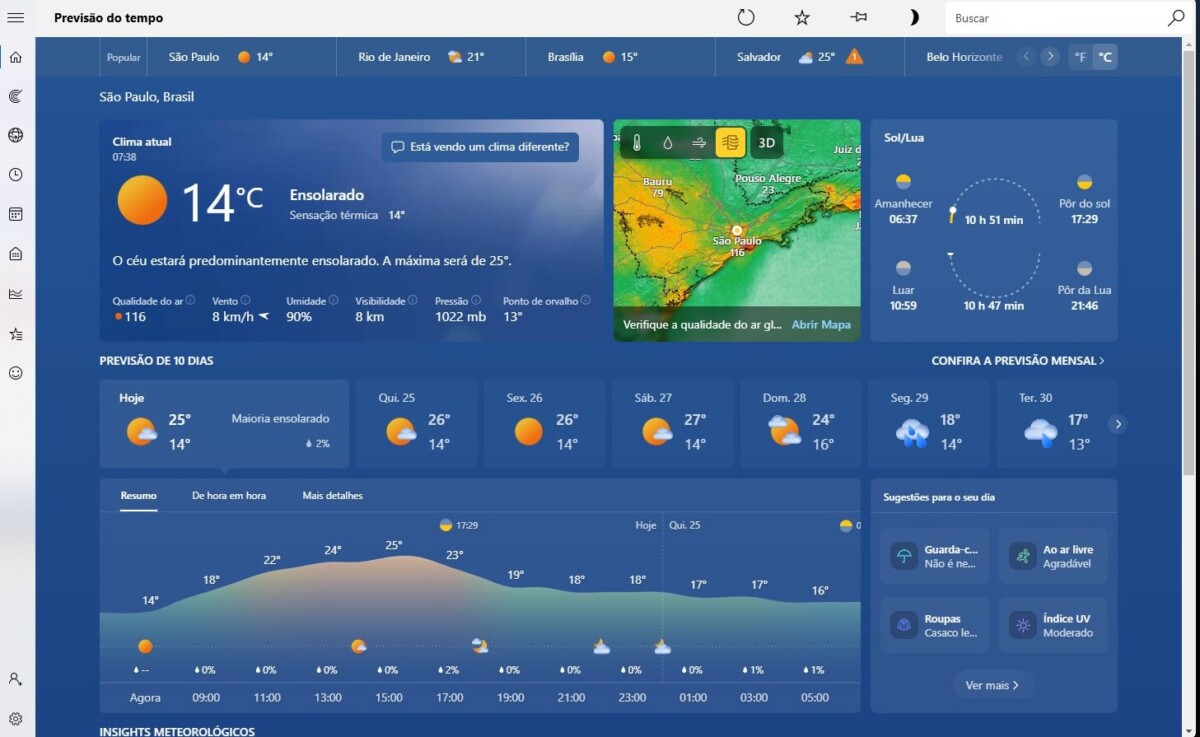O caso do Weather segue lógica semelhante ao do News. O aplicativo entrega previsões e alertas climáticos, mas o widget da barra de tarefas já cumpre essa função com mais agilidade e menos sobrecarga.