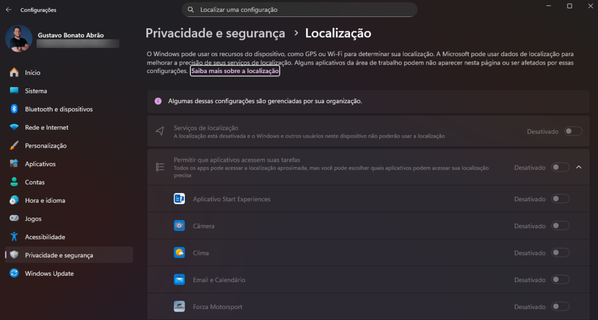 Para quem utiliza recursos de mapas ou previsão do tempo, desligar tudo pode não ser viável. O Windows permite manter o serviço principal ativo e selecionar individualmente quais softwares têm permissão de acesso.