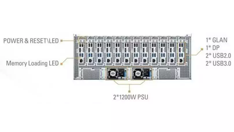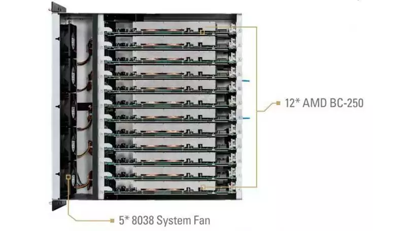 De acordo com as especificações, o aparelho apresenta em seu hardware um “design passivo de 12 x AMD BC-250 de mineração APU; 16 GB de memória RAM GDDR6; 5 ventoinhas para resfriamento e duas fontes de alimentação do servidor 1200W”. Não há, no entanto, CPU listada no sistema.