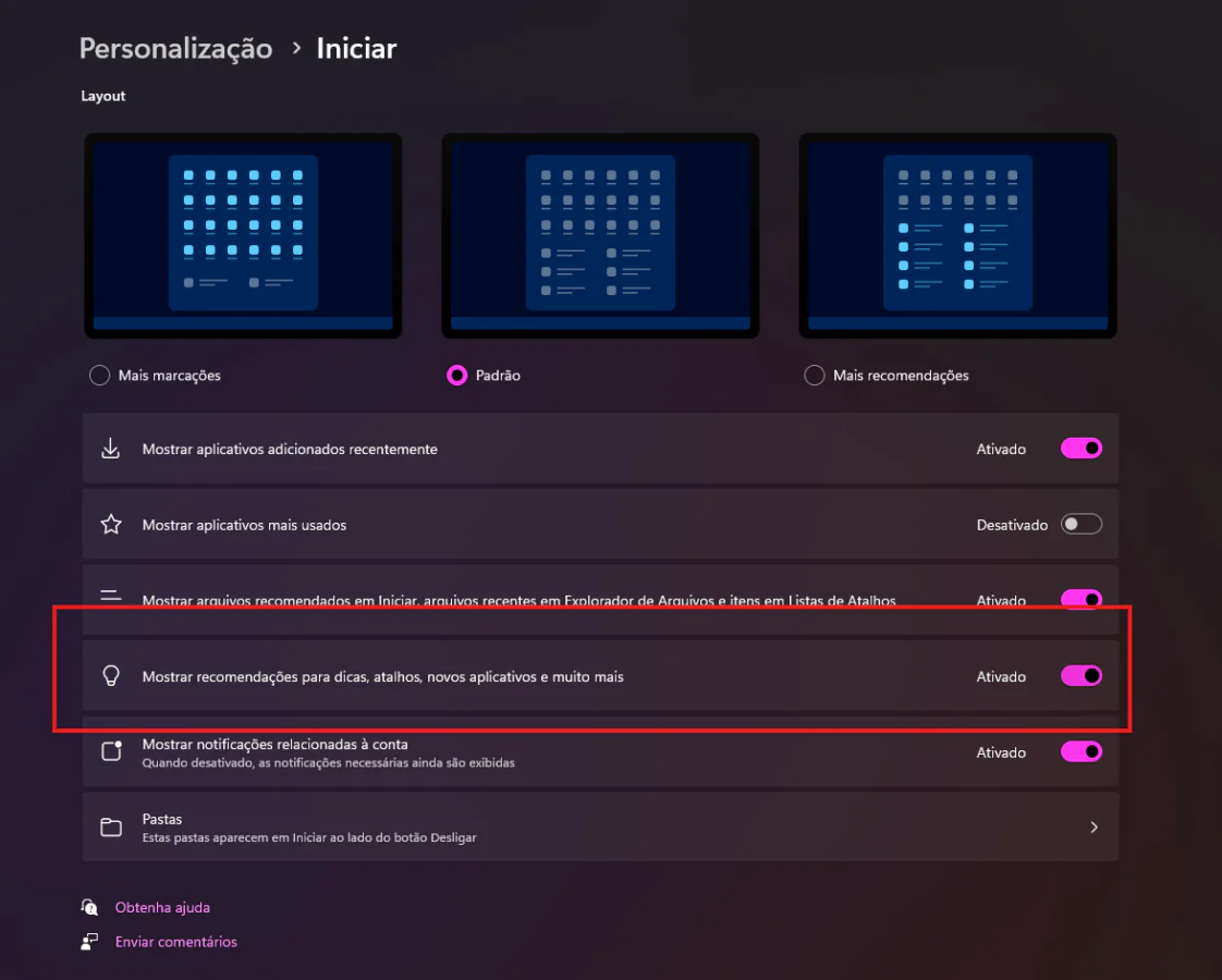 - Encontre a opção Mostrar recomendações para dicas, atalhos, novos aplicativos e mais e desative-a.
