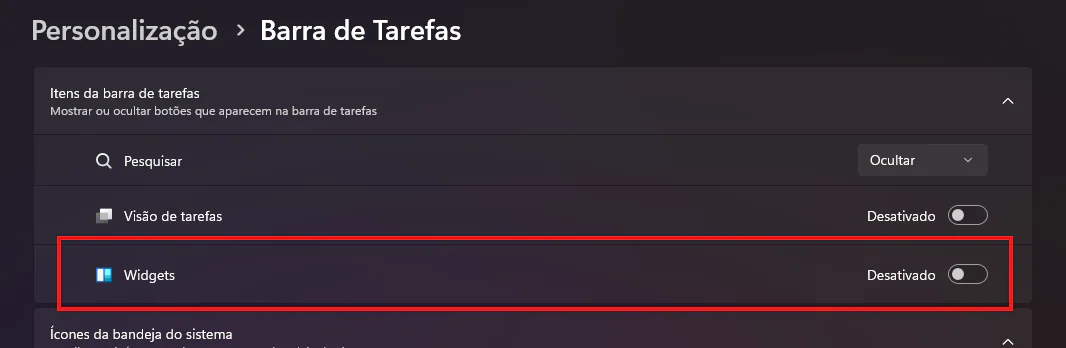 - Clique com o botão direito na barra de tarefas, escolha Configurações da barra de tarefas e desative a opção Widgets.